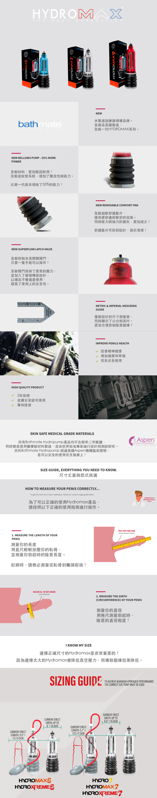 新型HydroXtreme9是Bathmate系列的最新產品。HydroXtreme9具有與HydroMax5、7、及11相同的強大功能,但略小一些,專為那些陰莖長度不超過9英寸但超過7英寸的人而設計。