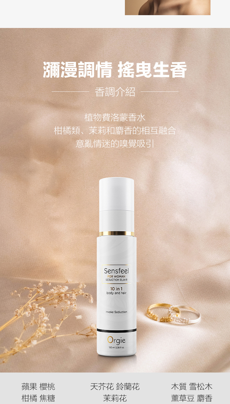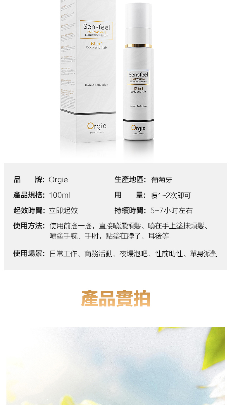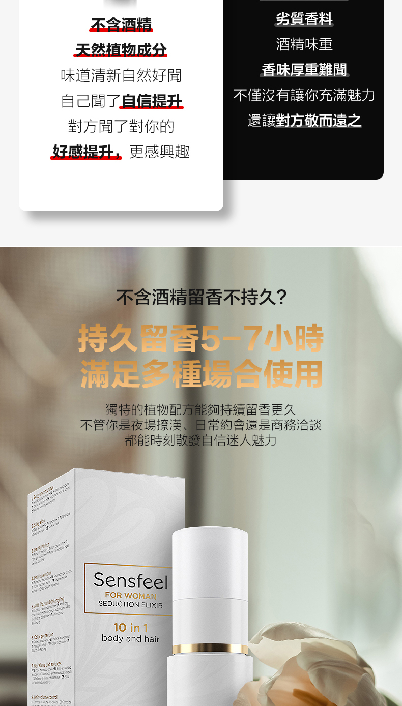 同時具有 10 大功能、包括:身體保濕霜、柔滑的皮膚、頭髮紫外線過濾器、髮梢修復、防毛躁和解纏結、顏色保護、頭髮光澤和柔軟、髮量控制、催情香水、喚醒身體吸引力。