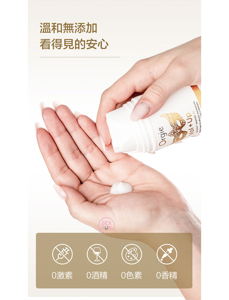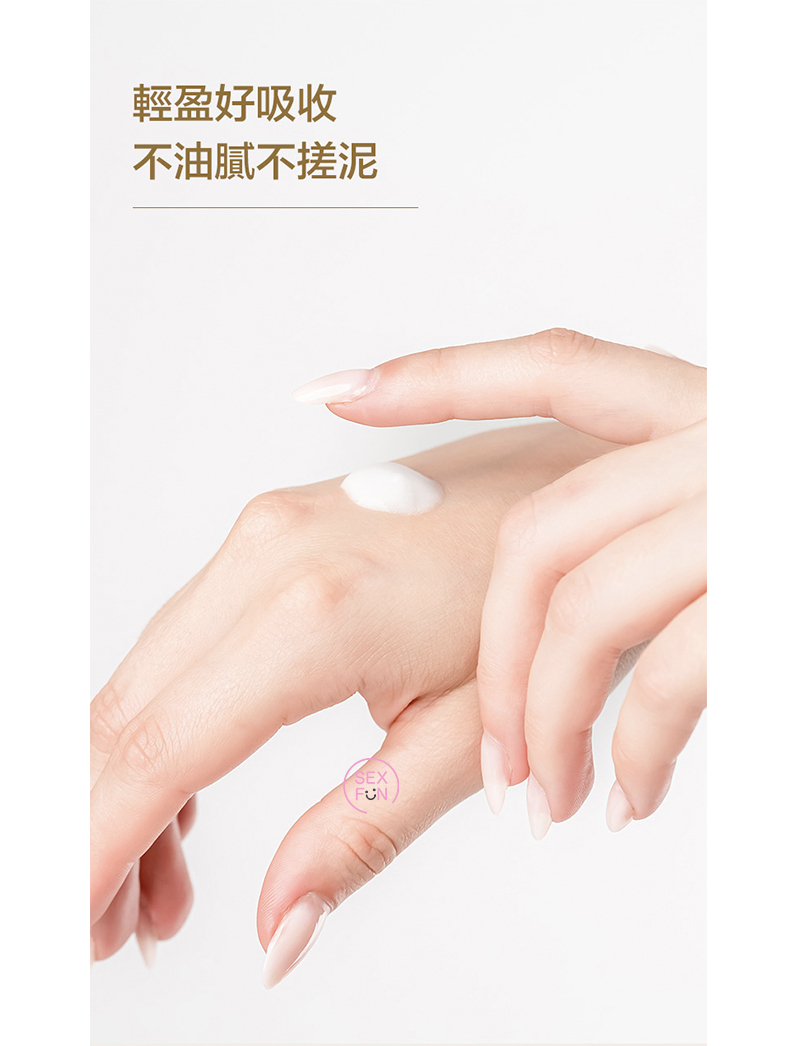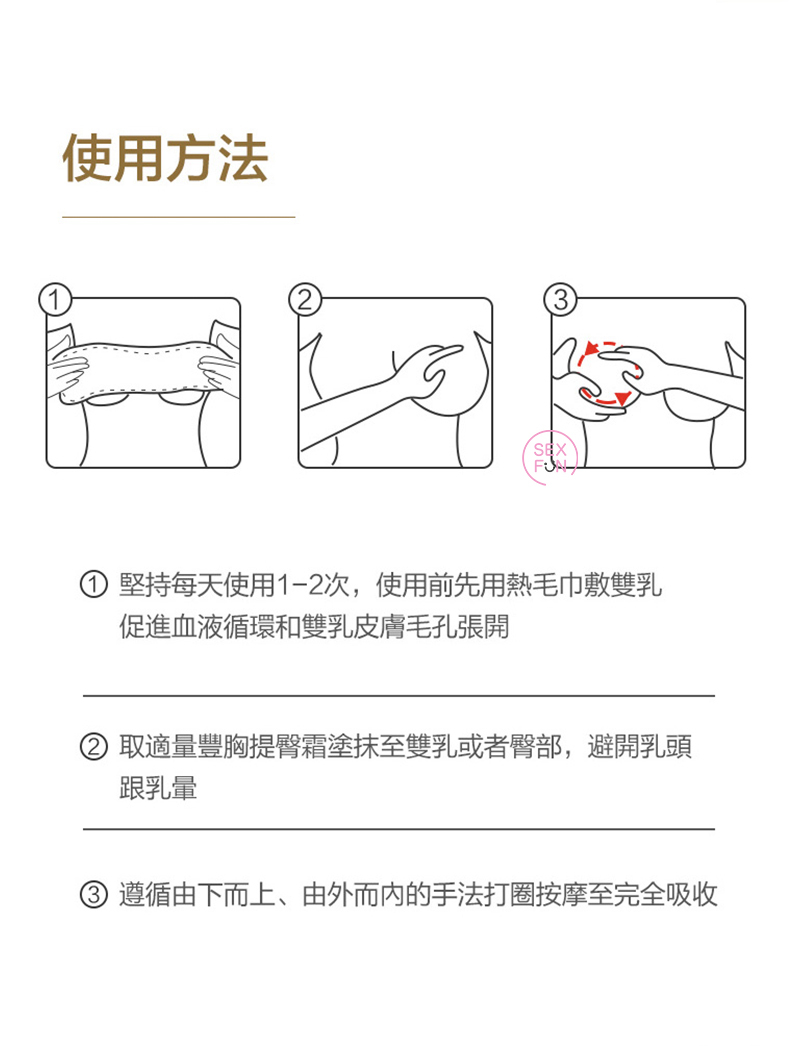 1. 塗抹適量在掌心回溫,以輕揉的動作從乳房大面積按摩,由外向內的打圈按摩直至微熱吸收。