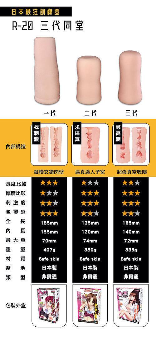 備受各界推祟的r20第3代終於推出,從1代開始已經是熱話,足以證明神器的受歡迎程度。綜合了不同的刺激紋路管道,肉壁吸力及子宮設計的秒殺能力,刺激度 vs 包覆感 vs 吸啜力,三項數據都達到均衡嘅極致啊!究竟佢有幾咁舒服?點解咁刺激?即刻來看R-20第3代的分析和評價: